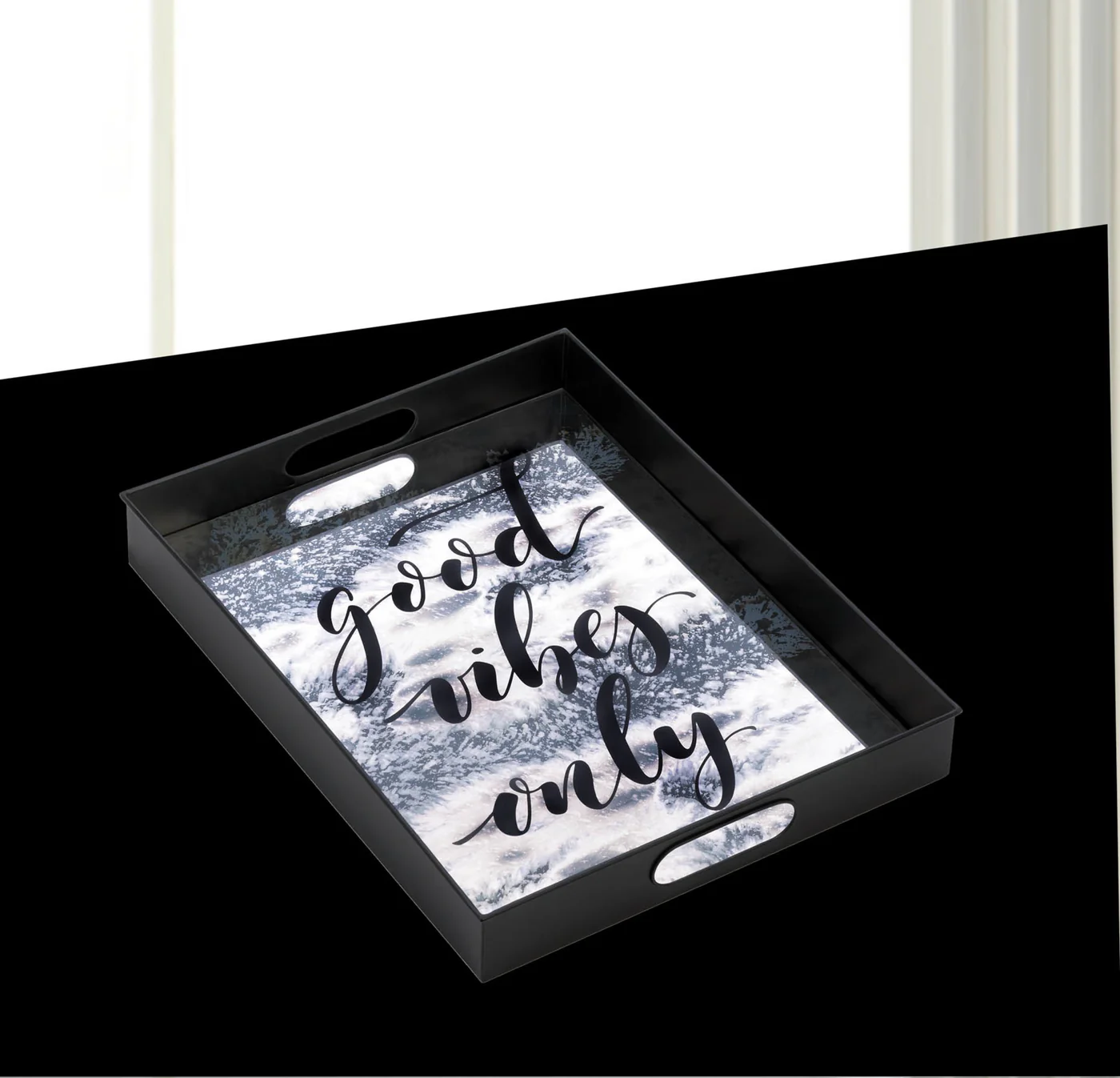 A fun way to display items on your vanity or ottoman, the South Beach “Good Vibes Only” Mirror Tray features a glossy black display that will glam up your décor. ||Rectangular tray with side handles. Black cursive writing.