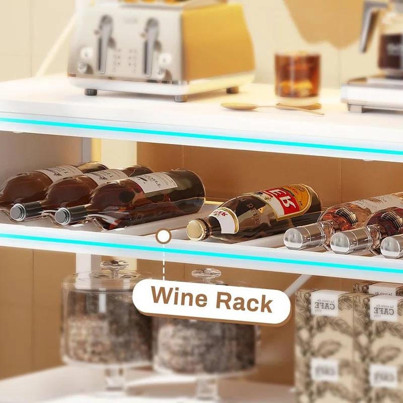 This White Modern Industrial Kitchen Baker's Rack with Multi-Color LED Lights is equipped with 2 AC outlets, and 2 USB charging ports to provide power for up to 4 devices simultaneously. The switch is convenient and safe to turn off power, no need to unplug appliances at all times. This 6 tier bakers rack with storage can easily keep the room tidy. Cool & Smart LED Light Strips The coffee bar comes with an RGB LED light strip, remote control via APP, Over 60000 colors, and 29 flashing modes for you to choose from. Led light strip with music sync function, built-in sensitivity adjustable mic, led light color will change with the rhythm of the sound and music. Large Storage Space The 35.2" L x 15.7" D table top can provide enough space to place a microwave oven, blender, coffee pot, spices, etc. when you prepare your meals in the free-standing kitchen. 10 S metal hooks can use these hooks to hang pots, pans, utensils, towels, oven gloves, cookbooks, and other items. Wide Using If you are looking for a shelf to hold your microwave oven, coffee pot, blender, spices, and other kitchen items, this baker's rack with power outlet is a good choice. Perfect for kitchen, office, bathroom, study, or garage as a bakers rack, microwave stand, coffee bar, garage, bookcase, or even storage cabinet.