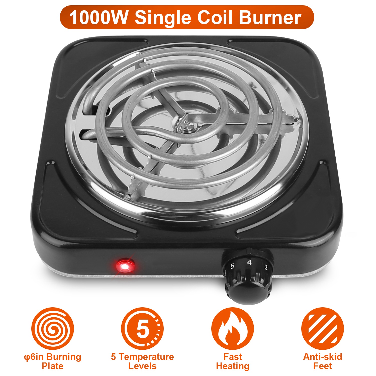 Home > 1000W Electric Single Burner Portable Coil Heating Hot Plate Stove Countertop RV Hotplate with Non Slip Rubber Feet 5 Temperature Adjustments