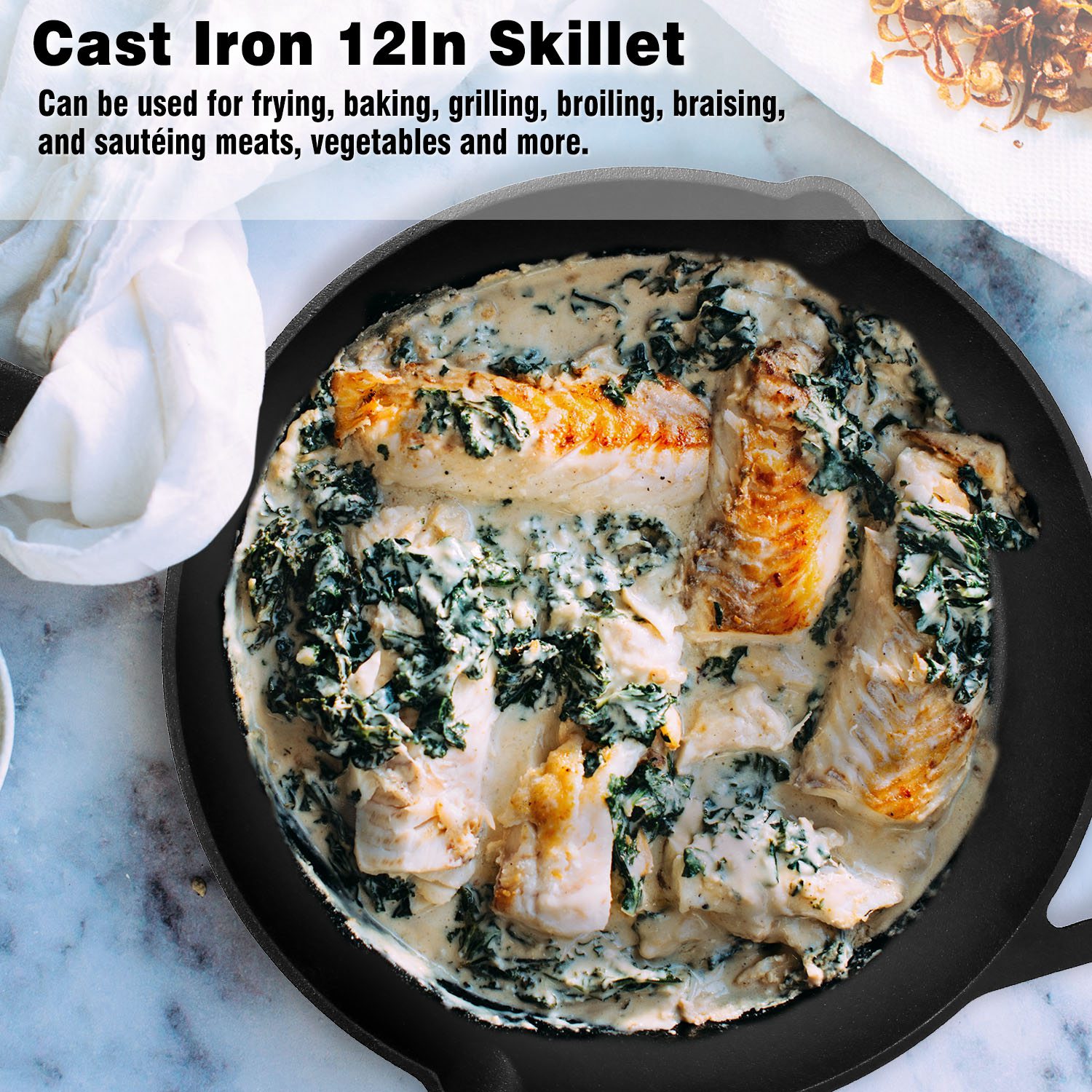 Pre-Seasoned Cast Iron Skillet Oven Safe Cookware Heat-Resistant Holder 12inch Large Frying Pan Non-Stick Like Surface Cooking Frying Searing Baking