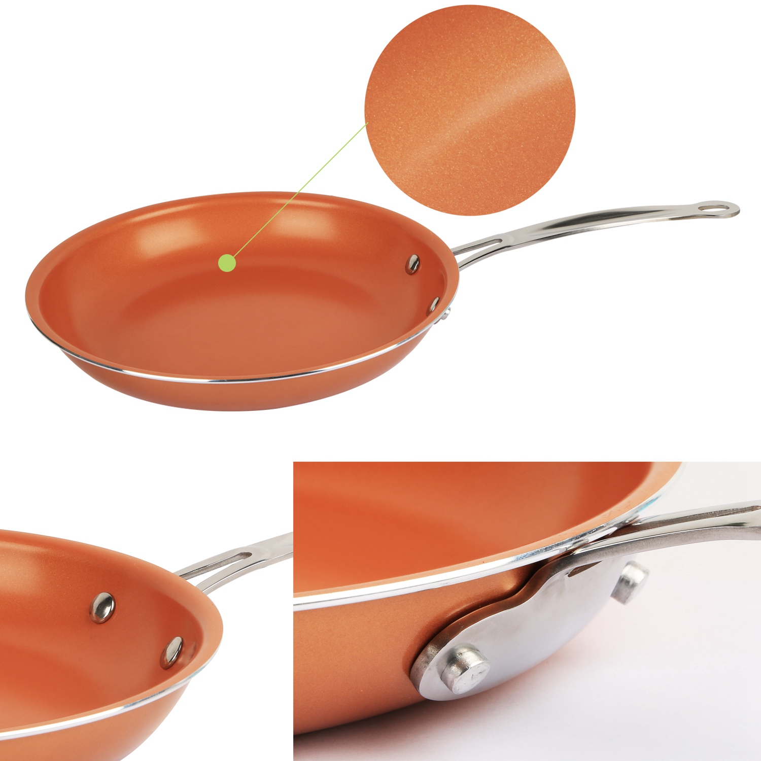 This aluminum frying pan with induction bottom is ideal for electric, induction and gas stoves. You can use it to fry or bake food as you prefer. The ceramic coating free of PTFE, PFOA and PFOS makes for non-stick and easy cleanup. Fast heating and cool down helps save the cooking time. Long handle with dual-riveted allows you to hold this pan firmly and comfortably. In addition, the elegant outlook brings out beautiful a scenery in your kitchen room.