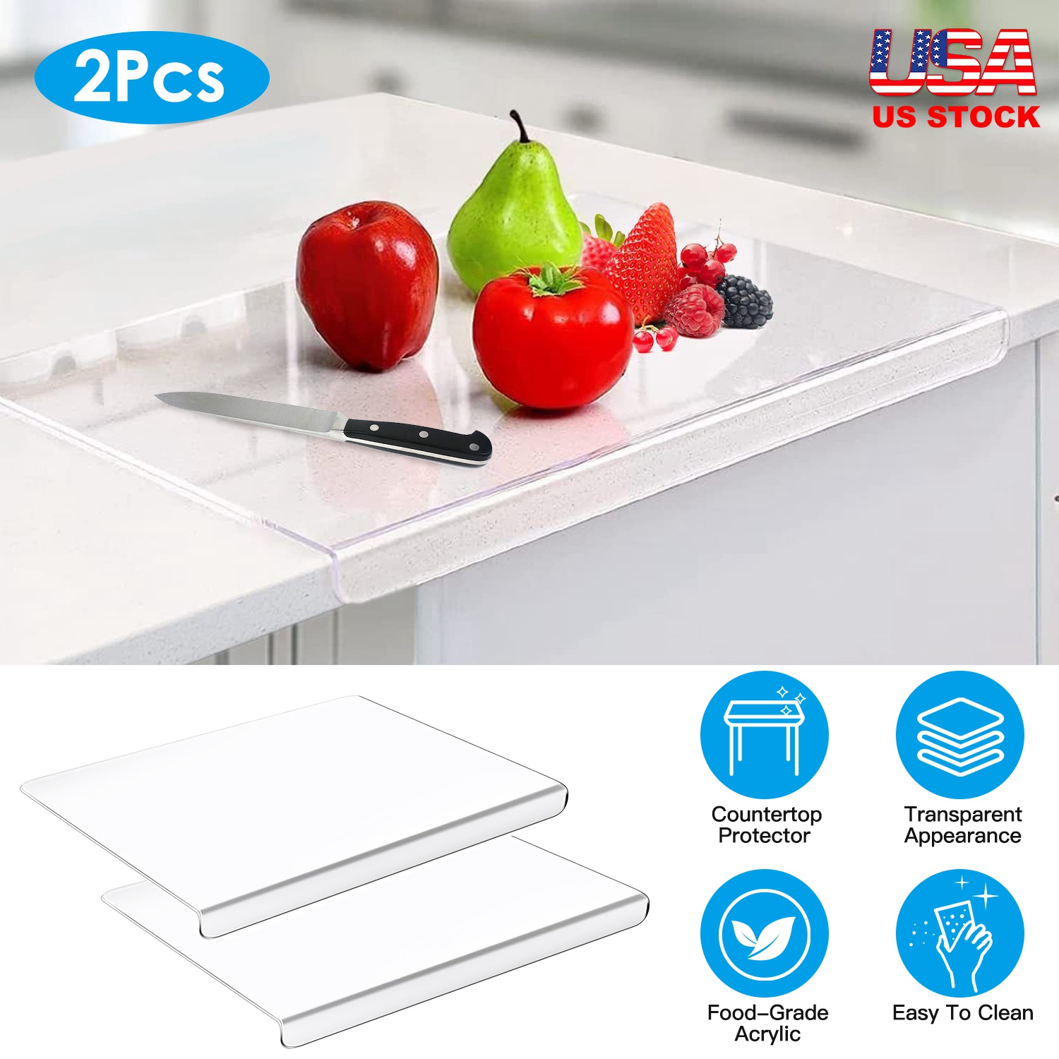 Measuring 17.71x15.74in in size, our large cutting board made of food-grade acrylic, which won’t easily deform, break and yellow, provides spacious operation space to satisfy your daily kitchen demands. Unlike other incongruous cutting boards, our clear transparent cutting board can perfectly match various decoration styles, just like part of your kitchen. Moreover, the 1.18in raised lip not only can prevent food from slipping off, but also can help you directly scrape food debris to trash can. Your must-have reliable and affordable kitchen essentials to keep the kitchen countertop always tidy and clean.