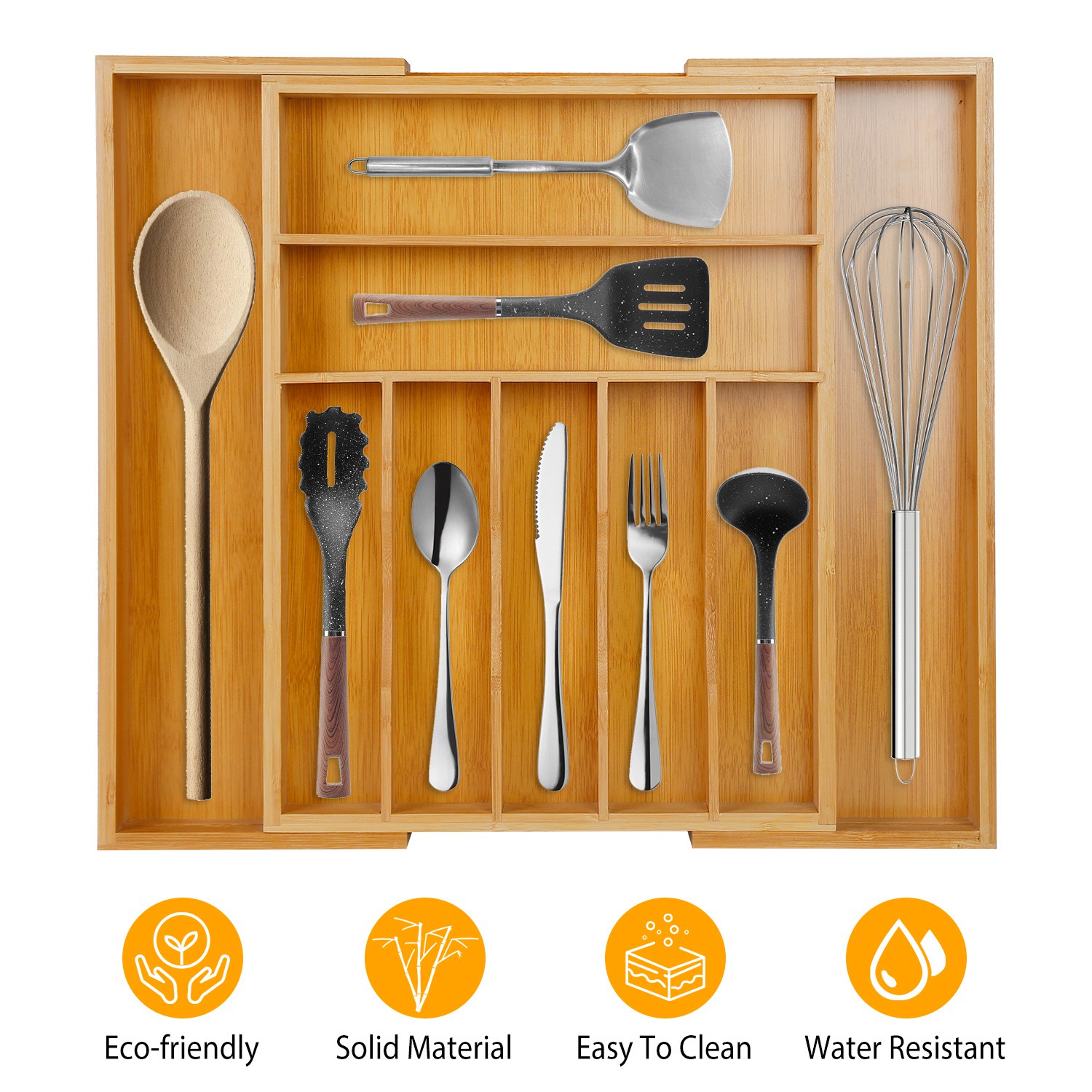 Bamboo Drawer Divider Kitchen Expandable Cutlery Tray Organizer Utensil Holder w/ Grooved Dividers