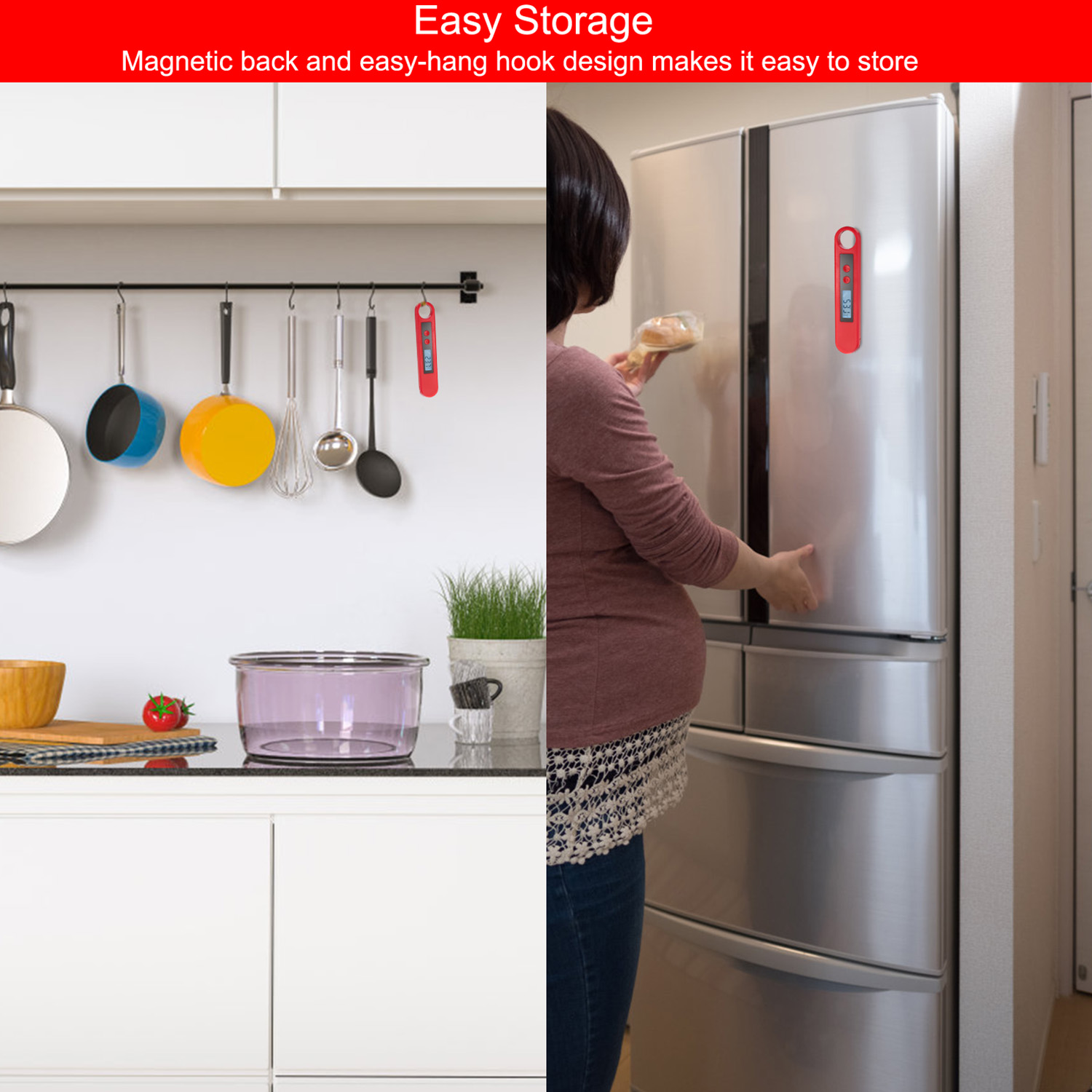 Our digital BPA Free meat thermometer is a great solution to get the real-time food temperature instantly and accurately during your cooking process. With a 4.2’’ foldaway food-grade stainless steel probe, you can feel free to measure food temperature. It features a LCD Display with backlight for clearly reading temp at Celsius (℃) or Fahrenheit (℉). In additional, it has inbuilt magnet and comes with a hanging hook, palm-size, easy to store and carry.