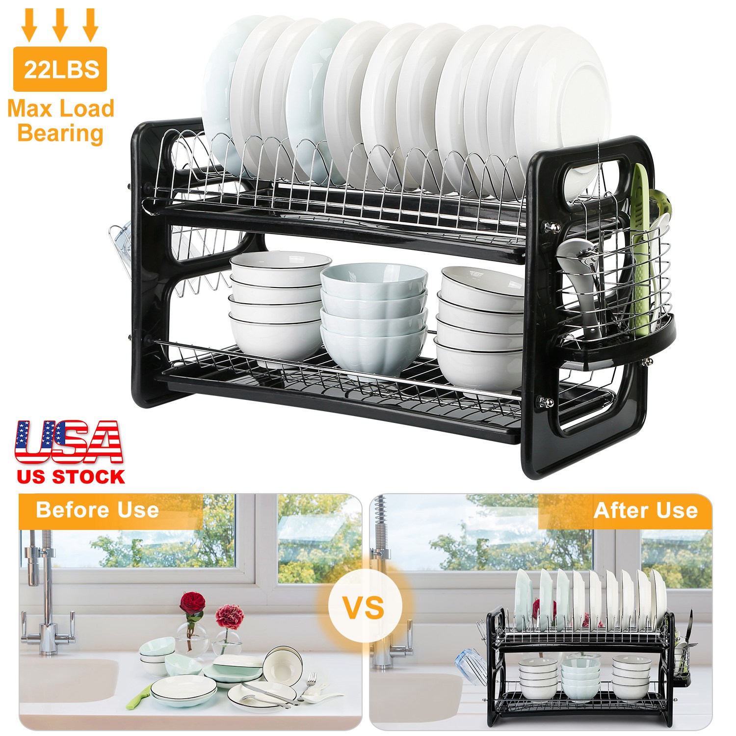 Are you still upset about the messiness of your kitchen? Are you trouble with the water leaking from wished dishes? This dish drying organizer rack is a must-have in your kitchen! Not only can be used as a dish drainer for air-drying kitchenware, but also an organizer holder for washed bowls, glasses, cups, plates, knife and fork, cookware and son on. This dish rack features large storage capacity and up to 22lbs load bearing. Don't worry about a wobbly top shelf, our dish rack is built tough and will not break.