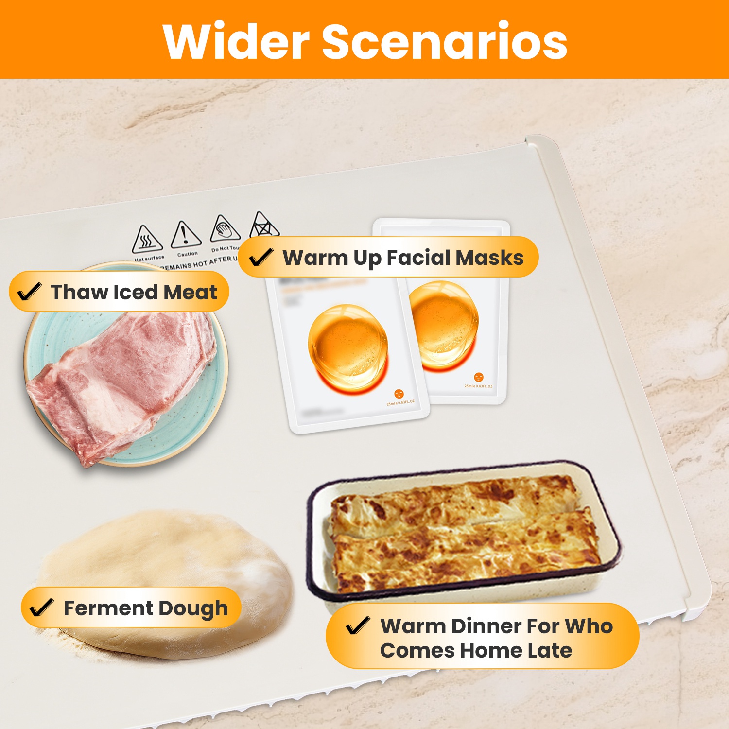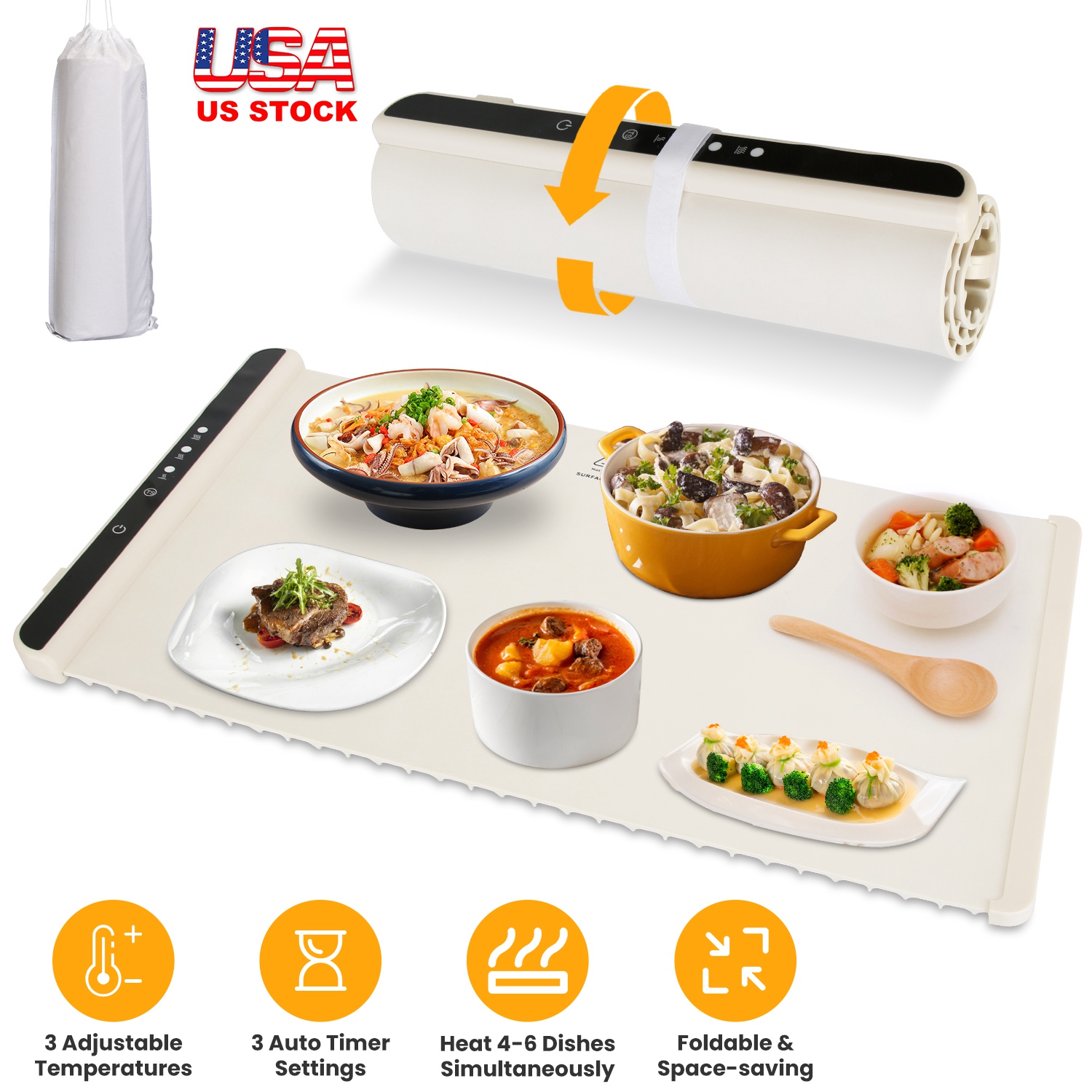 Dishes always get cold quickly? Measured with 25.98x15.35in and made of silicone and graphene, our electric warming tray not only ensures quick and even heat distribution, but also is able to heat 4-6 dishes at a time. Easily set the desired heat level for your food with 3 adjustable temperature settings(140℉/ 176℉/212℉). The 2H/3H/4H auto timer keeps you reassured when forgetting to turn off or unplug. Suitable for a various types of tableware and widely used when it comes to facial masks, thawing, dough fermentation and dinner leftovers heating. Come with a carry bag and design to be rolled up for easy storage and transportation. Perfect for large family gatherings, festive celebrations, or social dining with friends.