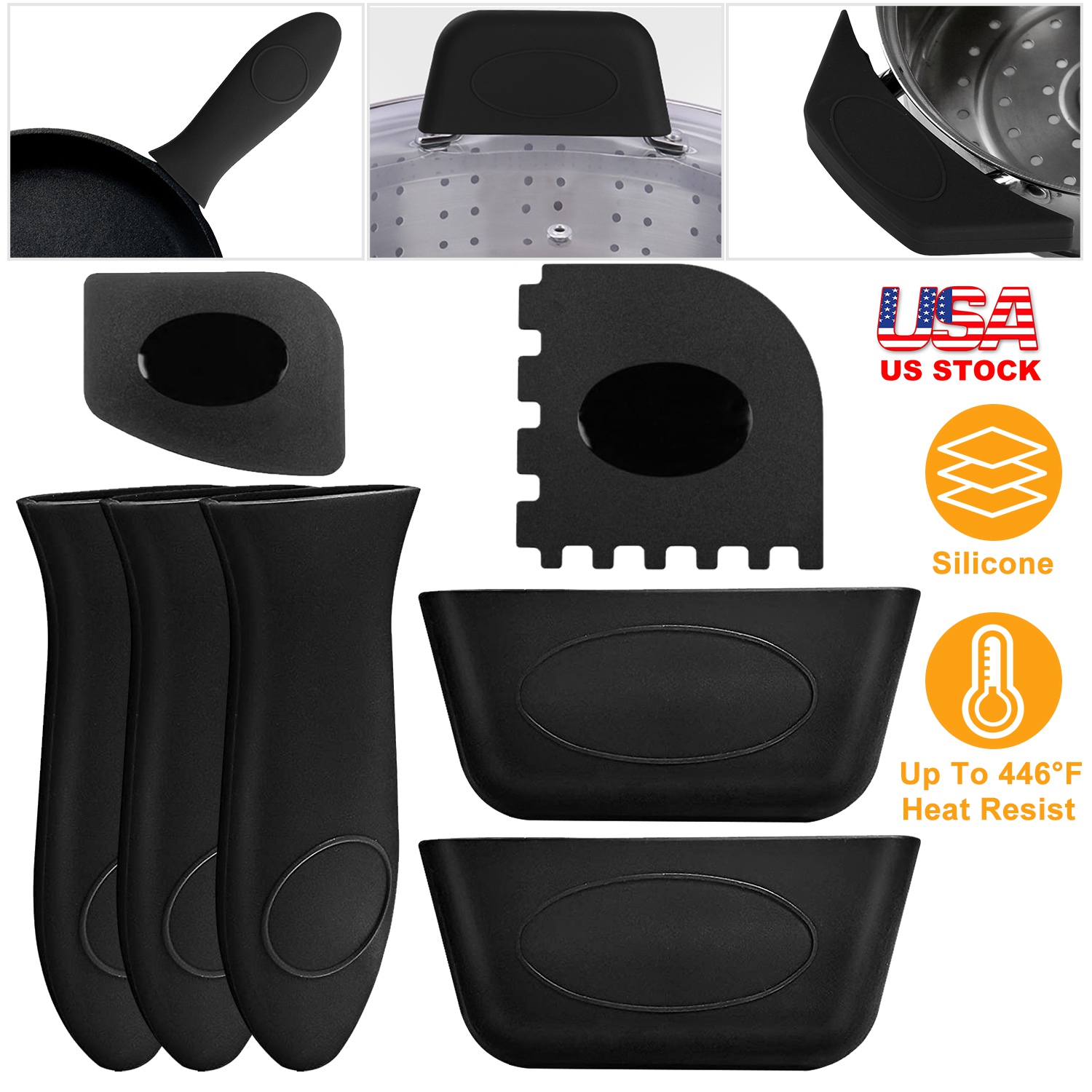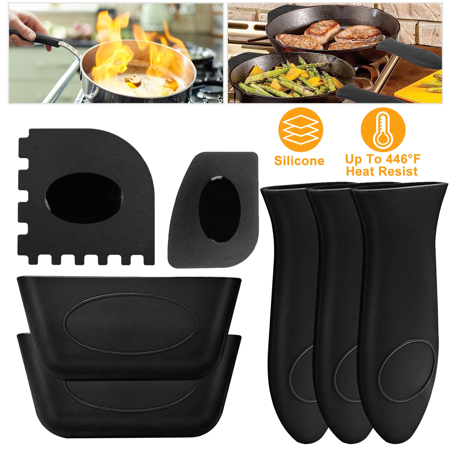 Our silicone handle holders are heat-resistant and a great addition to any kitchen. Just slide the holder onto the hot handle and remove pots and pans with ease. Just slide the holder onto the hot handle and remove pots and pans with ease. It can resist up to 446°F and create a safe and comfortable grip of hot cookware handles.