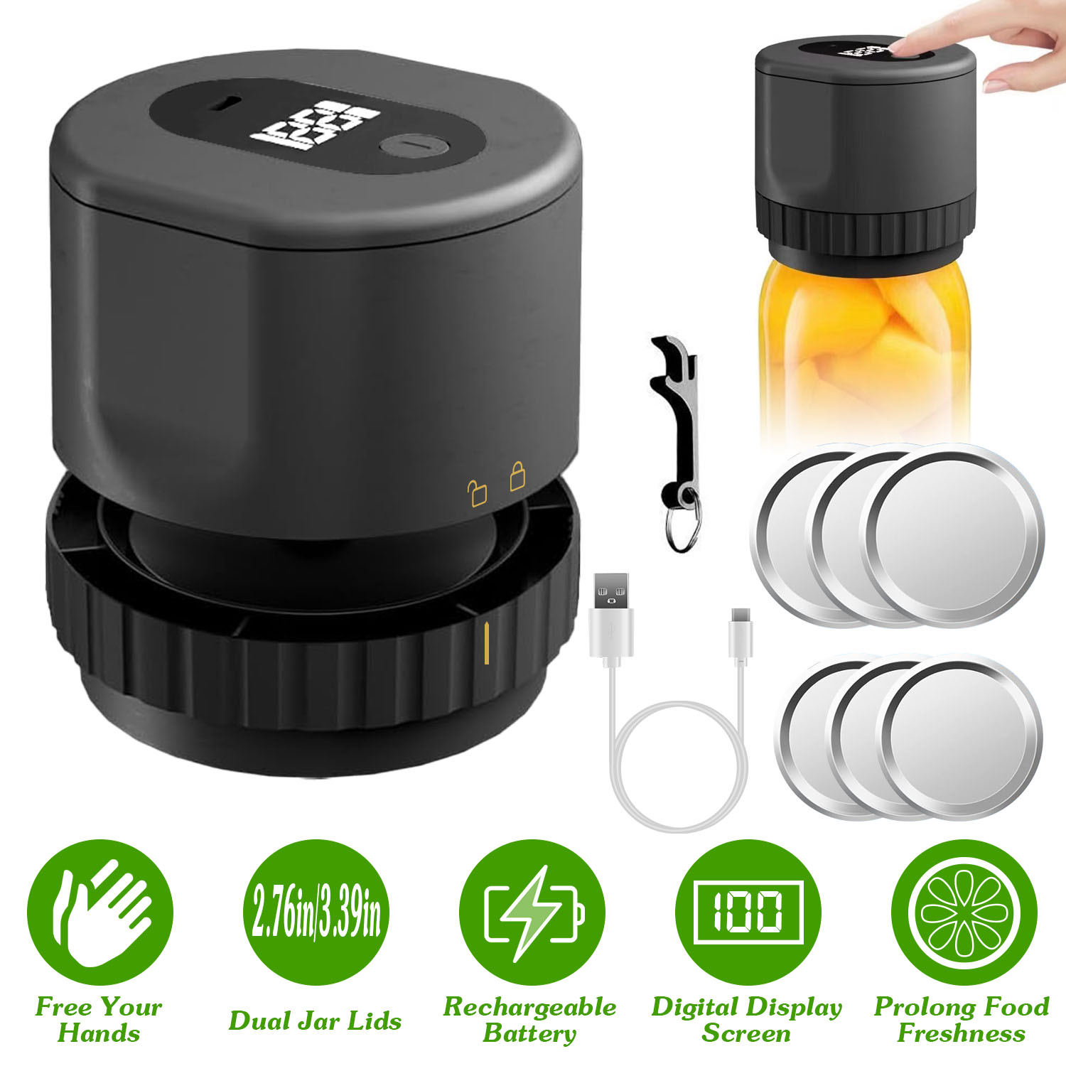 Compared to manual vacuuming, our electric vacuum sealer for mason jars achieves more effectively and time-saving air extraction to extend the freshness and nutrient keeping time of food, prevents off-flavors, peculiar smell and moisture, reducing the food wasting. Adopt built-in rechargeable battery, our cordless vacuum pump machine with digital display screen provides about 200times vacuum times, perfect for camping, picnic, travelling or other outdoor adventures. Come with 3* 3.269in wide mouth jar lids, 3* 2.67in regular mouth jar lids, type-c charging cable and bottle cap opener, we’ve prepared everything you need to start vacuum sealing from now on!