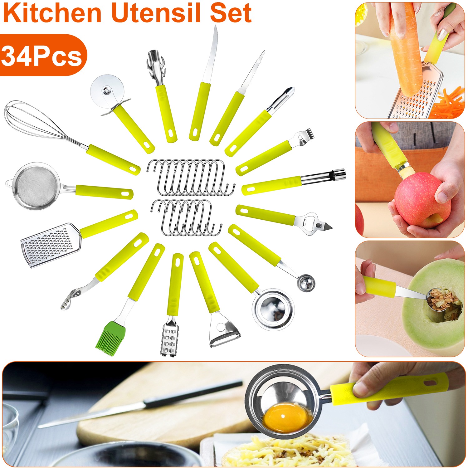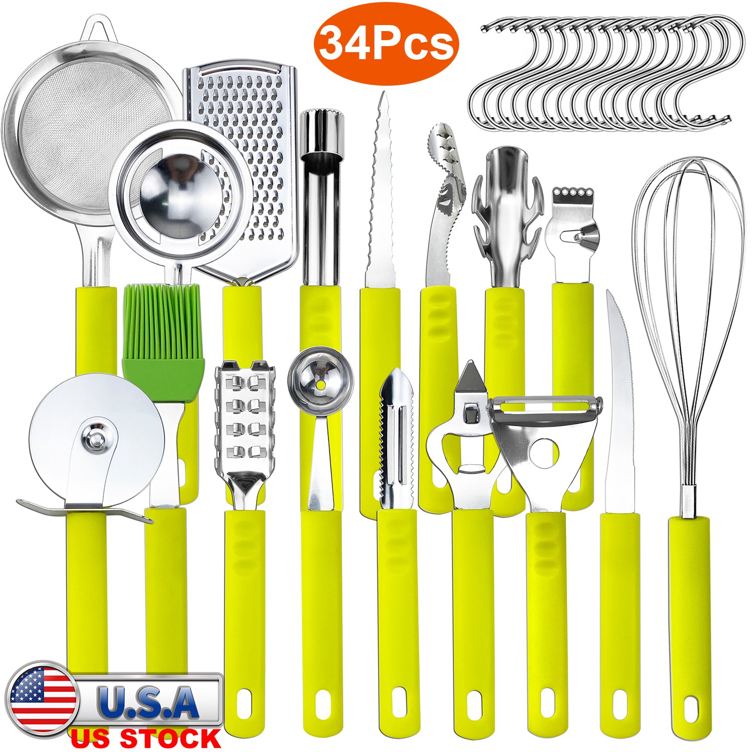 34 Pcs Kitchen Cooking Utensils Set Stainless Steel Kitchen Gadget Tools Core Removal Potato Peeler Whisk Pizza Cutter Steak Knife Bottle Opener