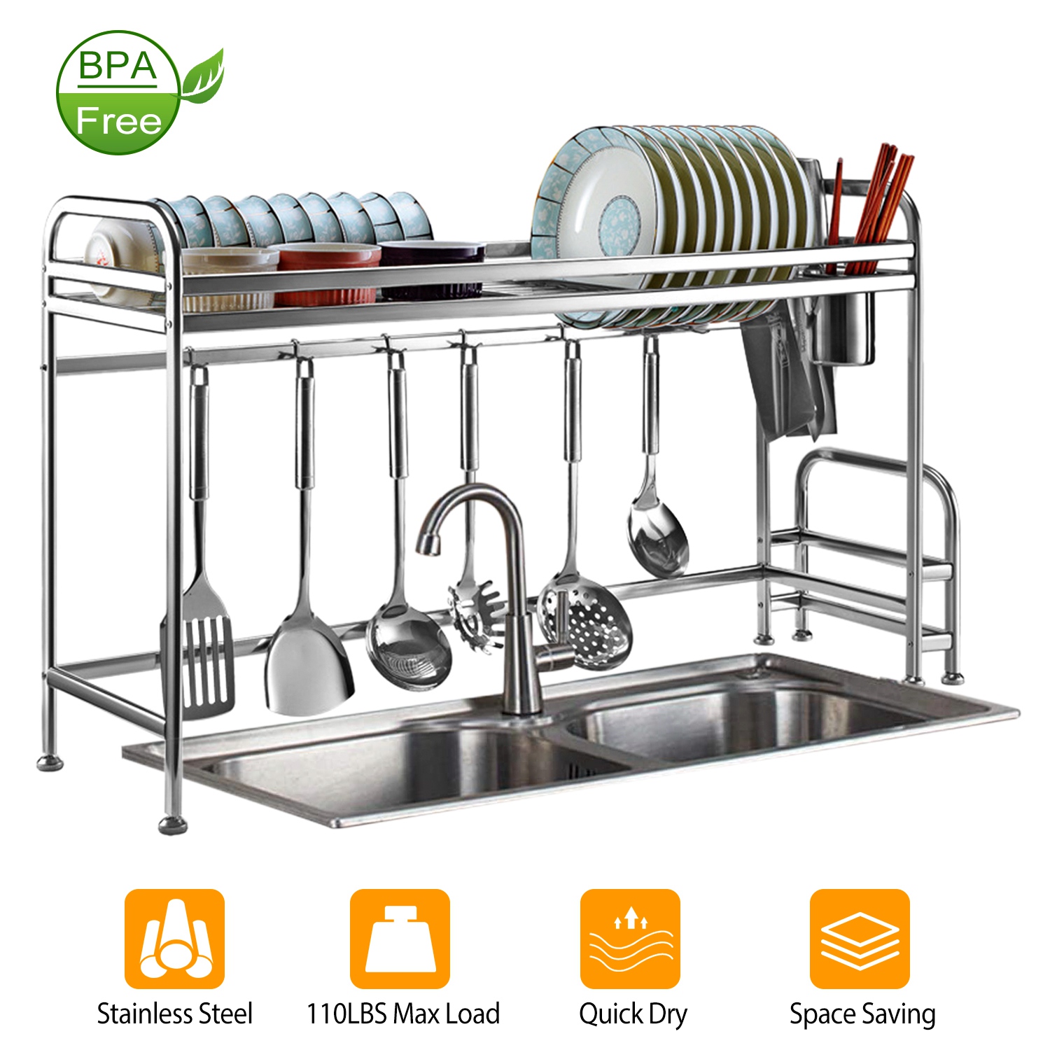 Our dish rack is a good kitchen helper to organize your dishes, cups, bowls, chopping board, seasoning bottle, cook ladle, cutleries, keeping your kitchen tidy and clean. Adopts 6 hooks and cutlery holder with drain hole design, keep your utensils dry and convenient to store. 110LBS max load and make full use of vertical space above the sink.
