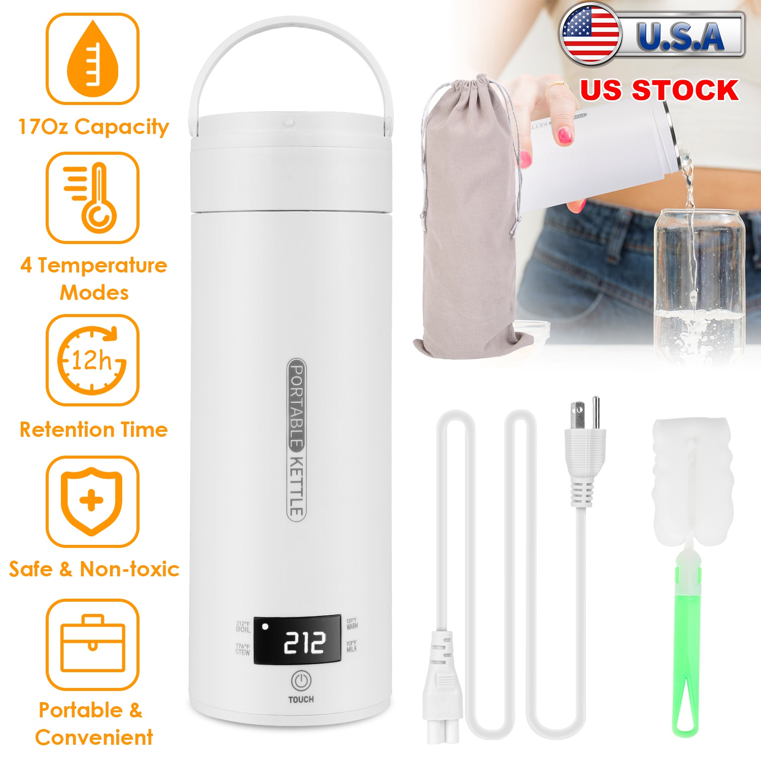 Looking for a portable electric kettle that allows you to take it anywhere? Featured with 4 preset modes(113℉/131℉/176℉/212℉), our electric kettle allows you to enjoy any hot or warm beverages, fully satisfying your drinking preferences. One button control, easy to operate. The LCD display also enables you to know the exact heating temperature. Keep drinks stay at the desired temperature for 12 hours in the plug-in state and 2 hours in the unplugged state. Made of with PP and 316 stainless steel, safe, non-toxic and leak-proof. The 500ml/17Oz capacity and the inbuilt handle make the kettle the right size for you to carry and drink from throughout the day. A perfect companion for home, office and travel.