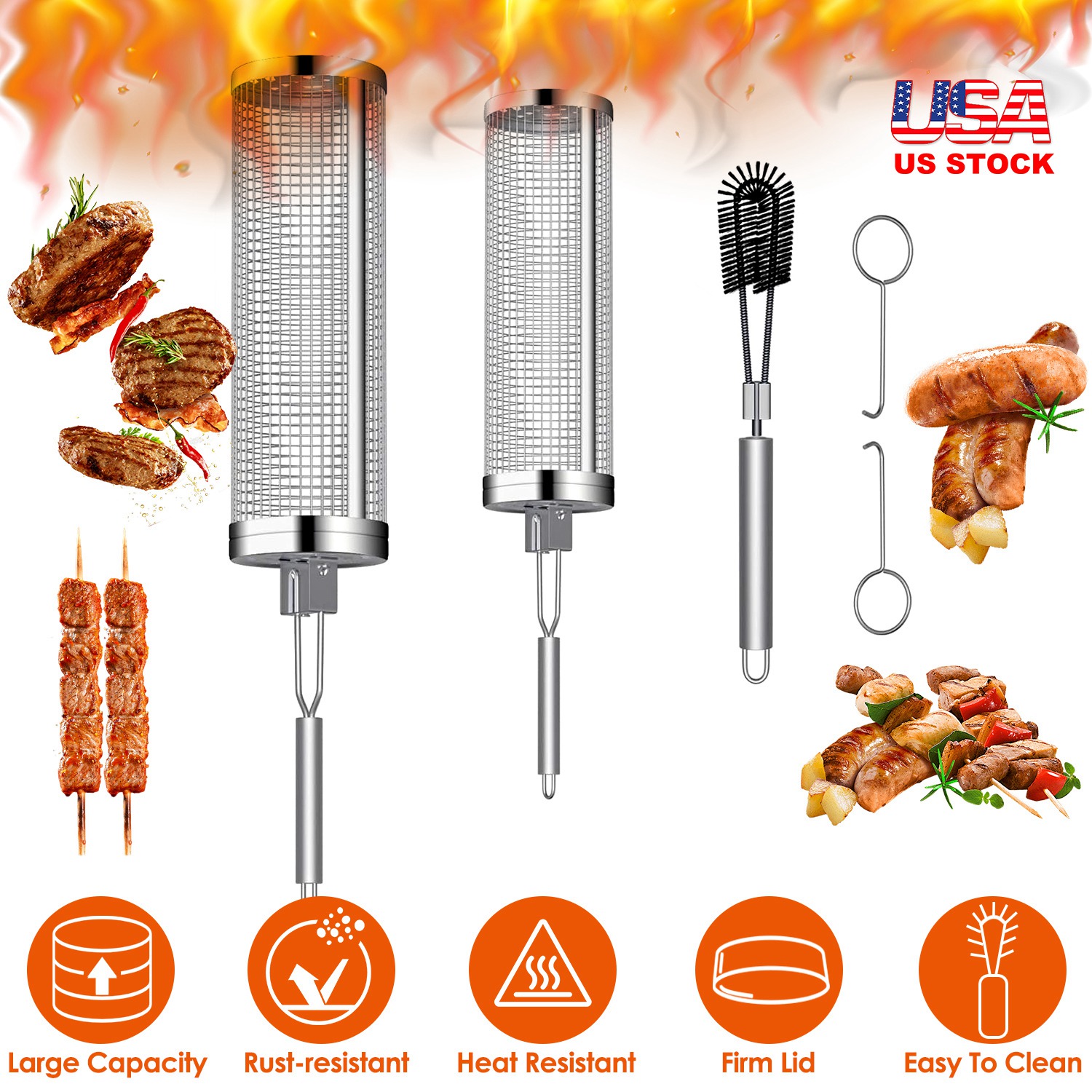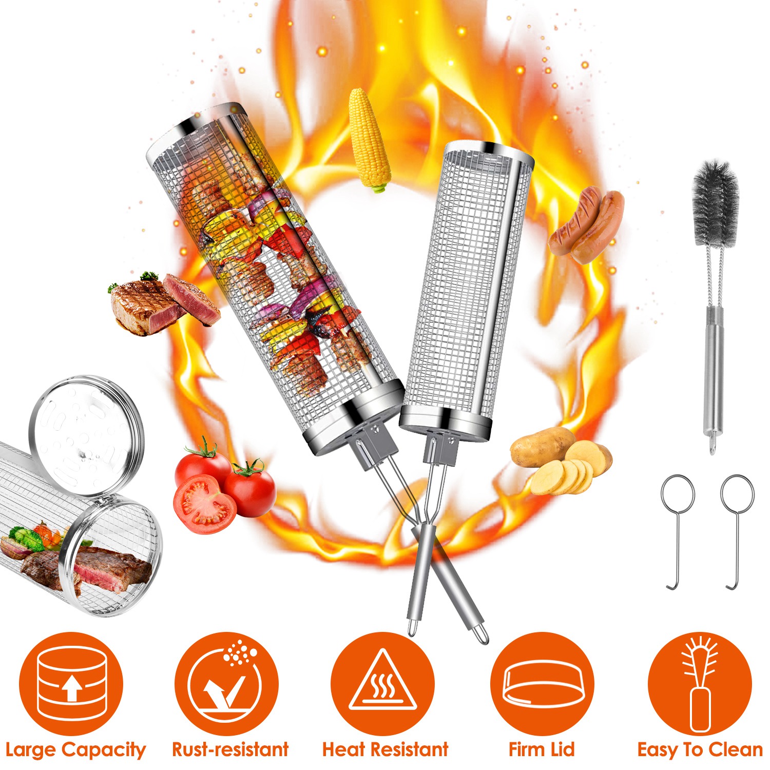 Looking for portable grilling accessories for outdoor grill? Try these BBQ net tubes! Made of rust-resistant 304 stainless steel, our rolling grill baskets can not only can withstand the heat of the grill, but also rotate 360 degrees to ensure that food is evenly heated. Features firm lids to secure food, portable handles to rolling the basket and convenient hooks to securely lock or unlock the baskets. Dishwasher safe and easy to clean with the included cleaning brush. Perfect charcoal grill accessories to cook food, such as asparagus, string beans, spinach, kale, brussel sprouts, french fries, meatballs, salmon and even fruits. Comes with 2 different size. Grill more food in less space at the same time!