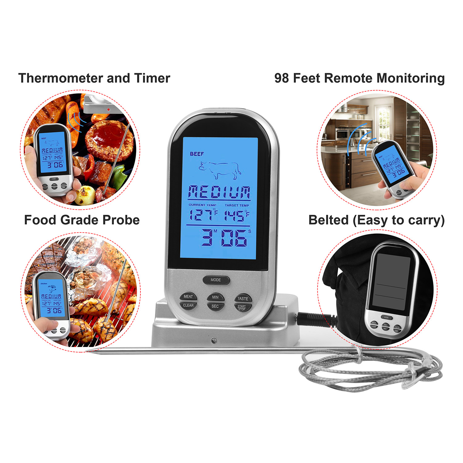 iMounTEK Digital Meat Thermometer W/Backlit LCD 98ft/30m Remote Monitoring Timer Alarm For BBQ Oven Grill Smoker Kitchen Outdoor Use